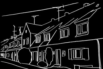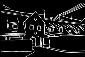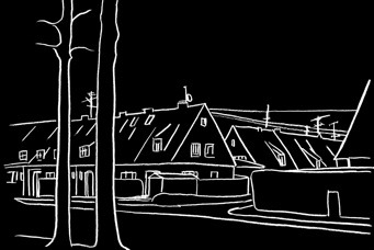 Michaela Melián erzählt die Geschichte Föhrenwalds (heute Waldram) als multimediale Installation. Ihre im dunklen Raum schwebenden Zeichnungen überblenden sich ineinander und imaginieren einen Spaziergang durch den Ort.